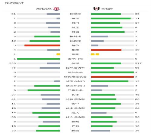 第84分钟,斯托克城后场被抢断,里德破门,富勒姆2-1